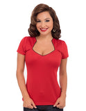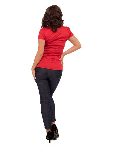 A wardrobe staple, the Sophia Top is classically flattering with its dramatic angular neckline. The red Sophia top features a contrast piping along the neckline, adding dimension and a pop of color to this classic vintage-inspired women's top. Create a casual look with denim jeans, or mix and match with either a pencil or a swing skirt. The possibilities with this vintage-inspired top are endless!