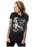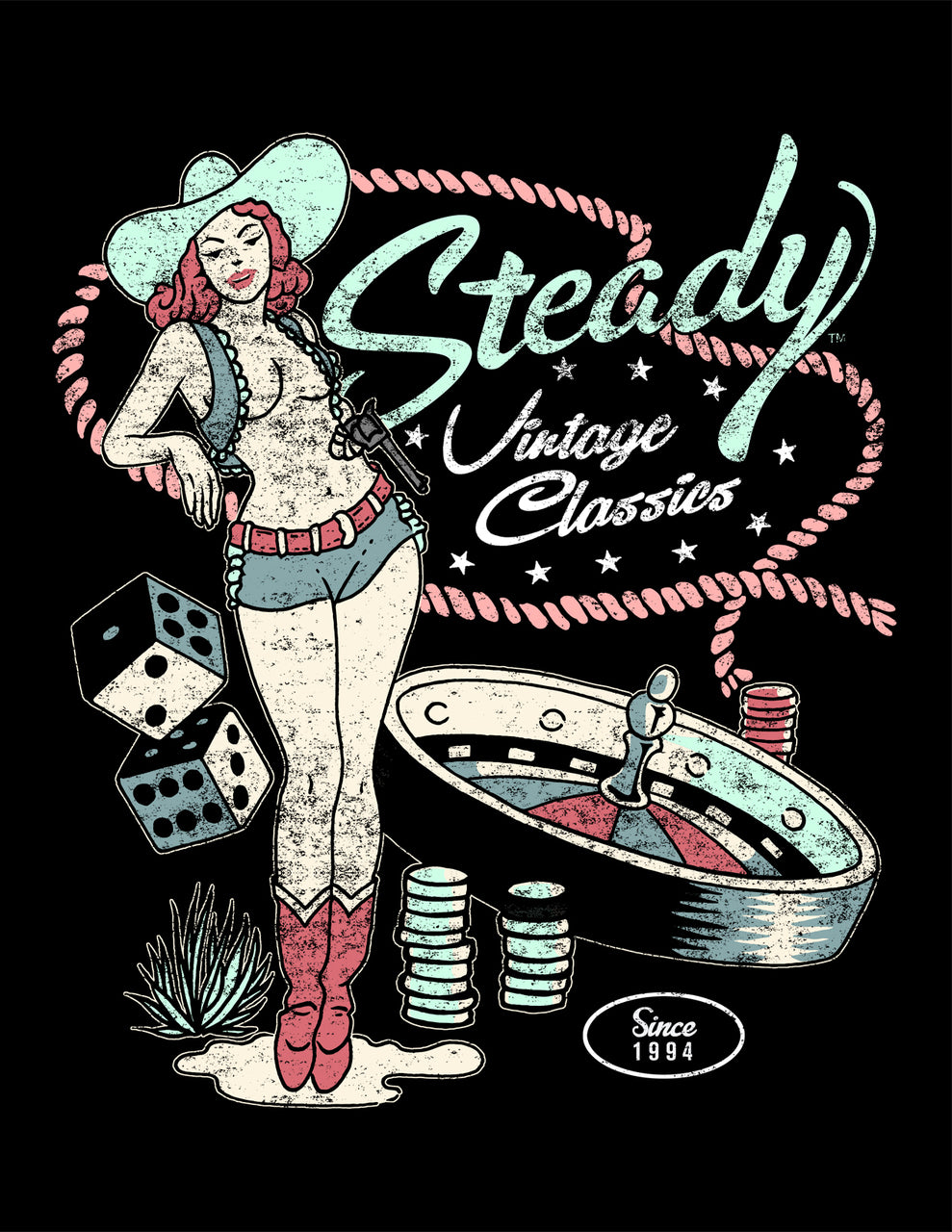 Our Steady Clothing tee has been revamped with a classic cowboy pinup standing next to a roulette wheel, die, and chips. The Steady logo is being lassoed by rope! This shirt pairs so well with our high waist skirts and pants!
